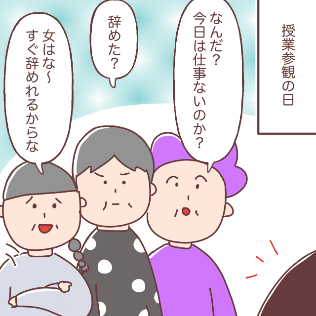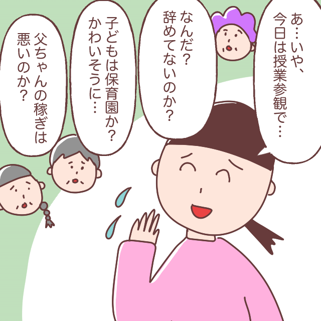 子どもの授業参観で保育園に行かなければならないのに、お構いなしに話しかけるおばあちゃんたち。平日の午前中にその場にいるだけで「辞めた?」だなんて、本当かんべんして欲しいですよね。