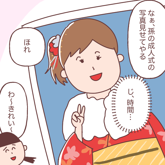 すると、「なぁ、孫の成人式の写真見せてやる」と突然言い出すおばあちゃん!「じ、時間・・もう行かなきゃいけないのに~っ!」そう思いながらも、「ほれ」と差し出された写真を見て、「わ~きれい~」と答えました。