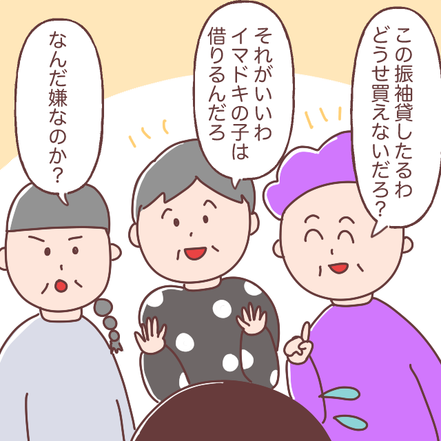 すると、「この振袖貸したるわ。どうせ買えないだろ?」「それがいいわ。イマドキの子は借りるんだろ」「なんだ嫌なのか?」と本当いつも好き勝手にしゃべり出すおばあちゃんたちは、