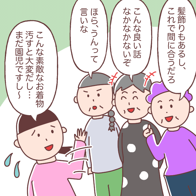 「髪飾りもあるし、これで間に合うだろ」「こんな良い話なかなかないぞ」「ほら、うんって言いな」と私に詰め寄ってしゃべり出し、「こんな素敵な置物、汚すと大変だし・・まだ園児ですし~」そう言って言葉を濁しました。
