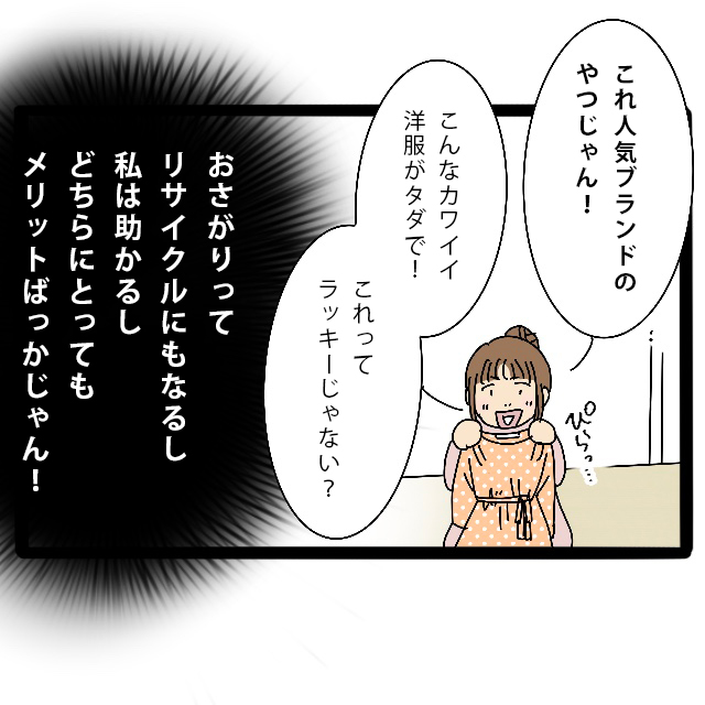 「これ人気ブランドのやつじゃん!こんなカワイイ洋服がタダで!これってラッキーじゃない?そう言って鏡の前で合わせる私は、「おさがりって、リサイクルにもなるし私は助かるし、どちらにとってもメリットばっかじゃん!」と心の中でワクワクしていました。