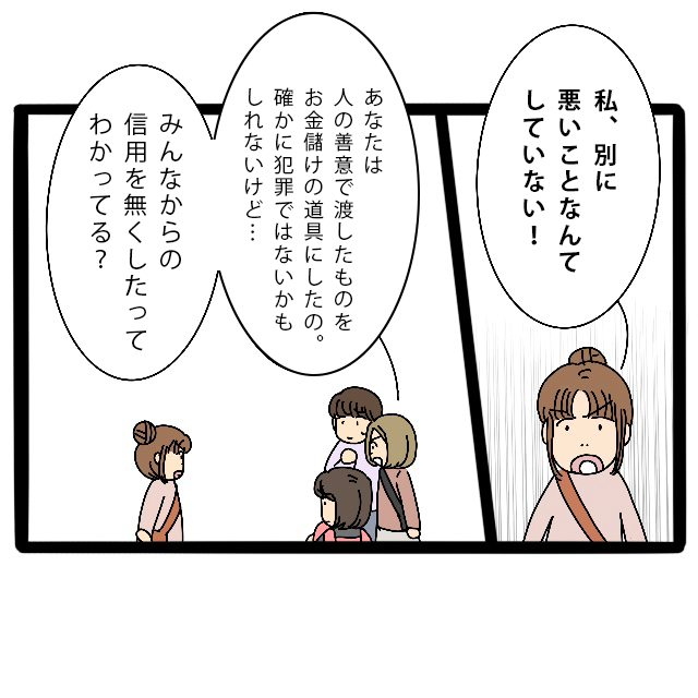 「私、別に悪いことなんてしていない!」そう反論する私に、ママ友はまっすぐ視線を向け「あなたは人の善意で渡したものをお金儲けの道具にしたの、確かに犯罪ではないかもしれないけど・・・みんなからの信用を無くしたってわかってる?」と言いました。