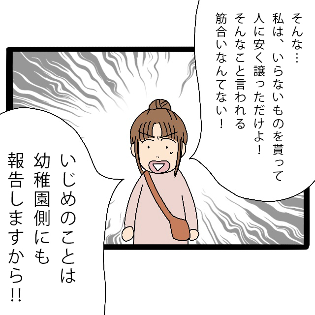 ものを譲る対価としてお金をもらっただけ・・・それの何が悪いって言うの?納得できずに言葉を荒げます。「そんな・・・私はいらないものをもらって人に安く譲っただけよ!そんなこと言われる筋合いなんてない!いじめのことは幼稚園側にも報告しますから!」私はそう言い捨てると、子どもたちの手を取ってその場を後にしました。