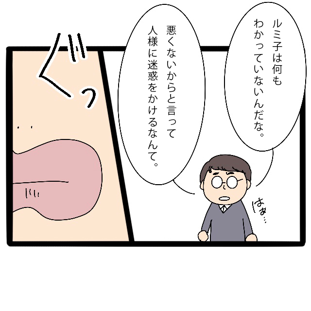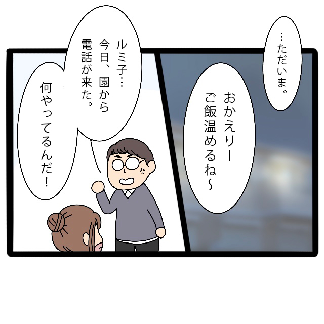 その夜、「・・・ただいま」と夫が仕事から帰ってきました。「おかえり、ご飯温めるね~」いつものように夕飯の準備をしていると、険しい表情でこちらへ向かってきます。すると、「ルミ子・・・今日園から電話が来た、何やってるんだ!」と突然私を叱りました。