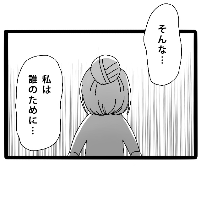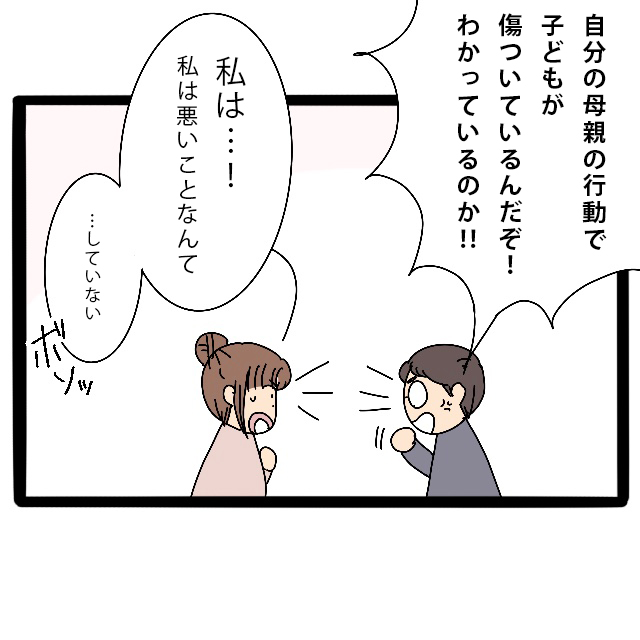 「自分の母親の行動で子どもが傷ついているんだぞ!わかっているのか!」いつもの穏やかな雰囲気とは打って変わって、感情的に声を荒らげる夫。自分のしたことが悪いとはどうしても思えず、「私は・・・!私は悪いことなんて・・・してない」と必死に言葉を返します。