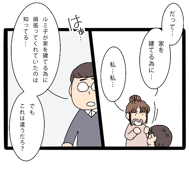 自分のためのお金が欲しかったわけじゃない。家族と将来のために、少しでも貯金を増やしたかっただけなのに。夫にわかってもらいたい一心で、私は必死に訴えかけます。そんな私を見て、夫は大きくため息をつき、「ルミ子が家を建てるために頑張ってくれていたのは知ってる・・・でもこれは違うだろ?」と言いました。