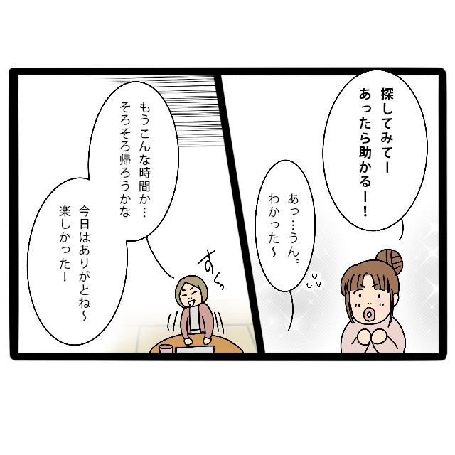 「あまり着ていない服ならある」その言葉に、私は目を輝かせながら「探してみてーあったら助かる!」と食い気味に言いました。さとしくんママは、少し圧倒された様子で「あっ・・・うん、わかった~」と答えます。