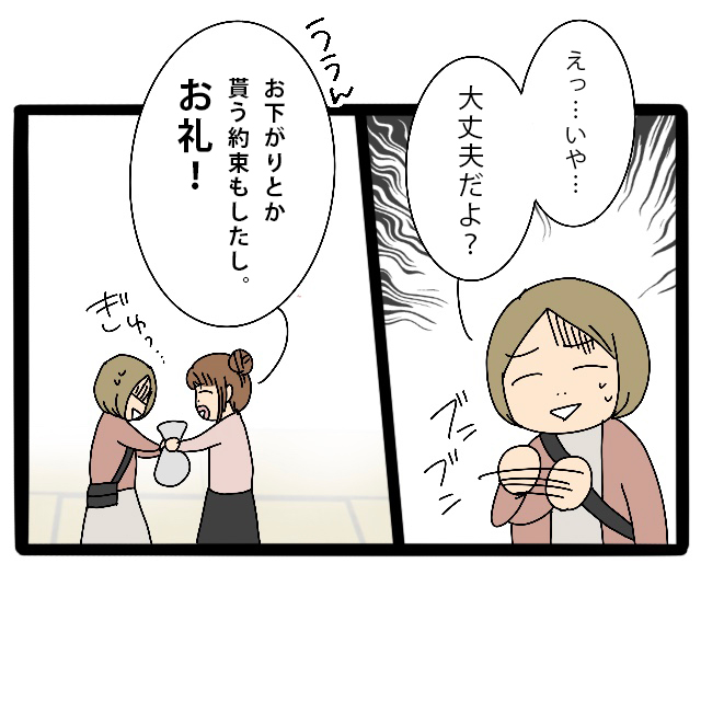 「えっいや・・・大丈夫だよ?」もらえないよーと勢い良く手を振って遠慮するさとしくんママ。私は「ううん、おさがりとかもらう約束もしたし、そのお礼!」と言い、さとしくんママにお菓子の袋を渡しました。