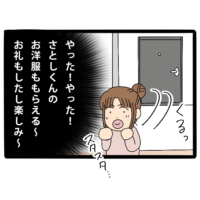 ドアがバタンと閉まった瞬間、私は思わずガッツポーズを取りました。「やった!やった!さとしくんのお洋服もらえる~お礼もしたし楽しみ~」これでもっとお金を浮かせられる!私は鼻歌を歌いながら部屋に戻りました。