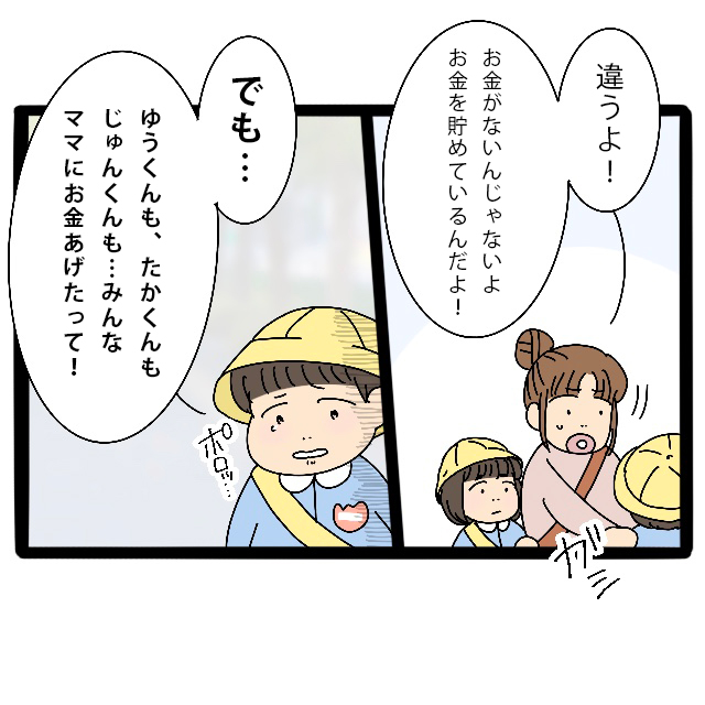 私はそらの肩をガシッと掴み「違うよ!お金がないんじゃないよ、お金を貯めているんだよ!」と言います。嫌な思いをしたのか、そらは涙をポロポロとこぼしながら「でも・・・ゆうくんも、たかくんも、じゅんくんも・・・みんなママにお金をあげたって!」とつぶやきました。