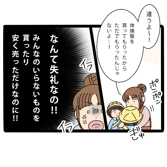 「違うよ~!体操服を買ってもらったから・・・ただでお金をもらったんじゃないよ!」私は声をあげて泣くそらをぎゅっと抱き寄せ、背中をポンポンと叩きながらなだめます。そして「なんて失礼なの!みんなのいらないものをもらったり安く売っただけなのに!」と心の中で怒りを募らせました。