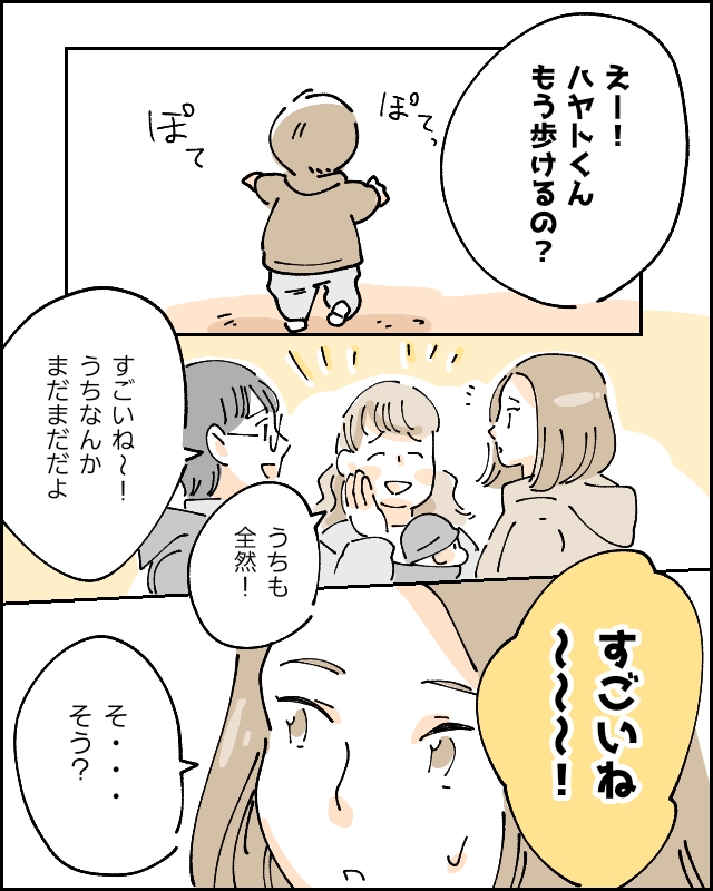 ハヤトが歩くのを見て、ママ友たちから驚きとともにたくさん褒めてもらいました。同じ月齢の子たちは、まだぜんぜん歩ける段階ではないのだとか。すごいすごいと言ってもらえて、もちろん嬉しかったのですがはじめはあまりピンと来ていないと言うか、そんなすごいことだとは自覚がありませんでした。