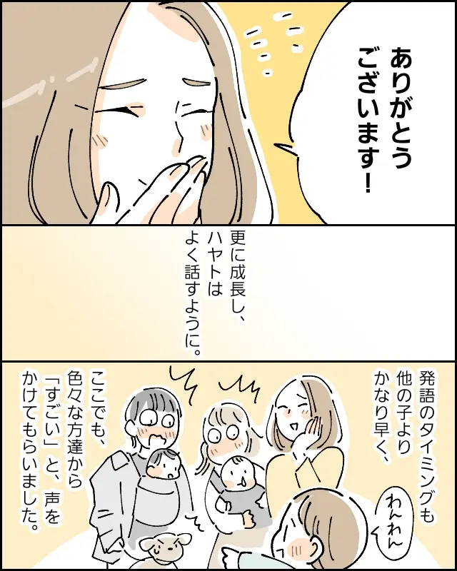 でもよく考えてみたら、健診でも順調な成長だと褒めてもらえたし、近所の人やすれ違う人たちにもあんよが上手、すごいと褒められていくうちに、ハヤトは成長が早いのだな、運動神経が良いのかなと思うようになりました。だって、こんなにもたくさんの人たちがわざわざ声をかけて、称賛してくれるんだもの。