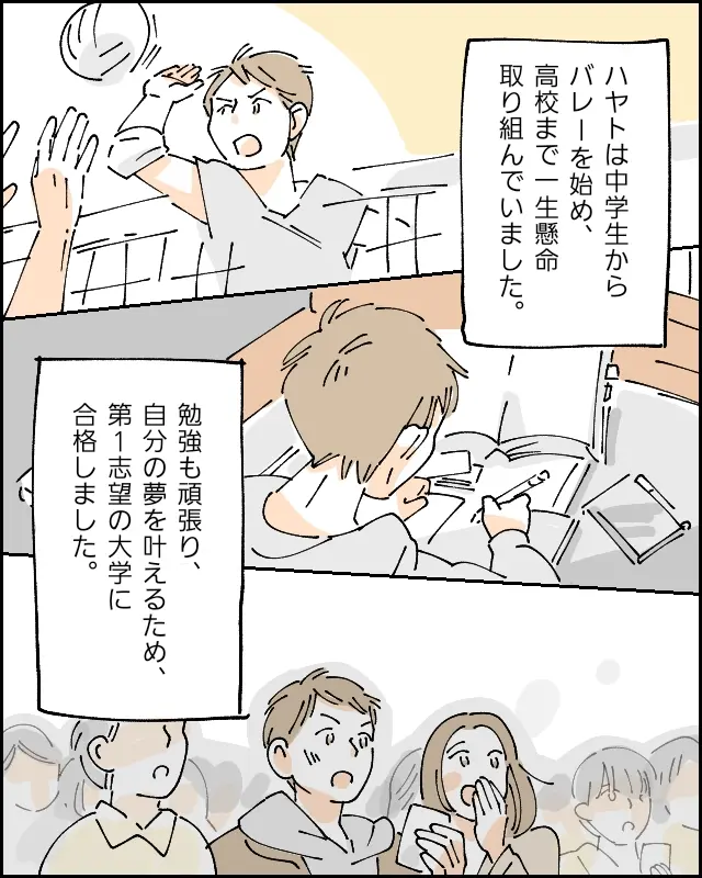 その後、ハヤトは中学生からバレーボールを始め、高校まで一生懸命取り組んでいました。勉強も頑張り、自分の夢を叶えるため、第1志望の大学に合格しました。合格発表を見に行った時は本当に驚いて・・。