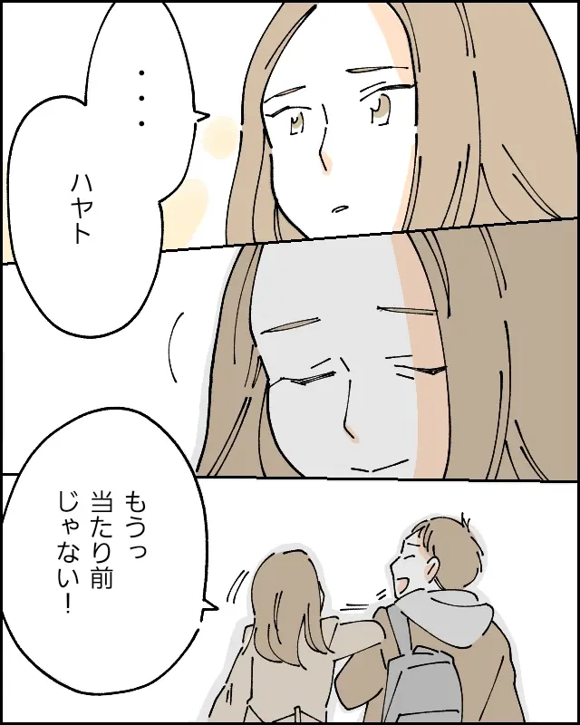 「・・ハヤト」そう呟いた後、「もうっ!当たり前じゃない!」とハヤトの肩を小突きました。
