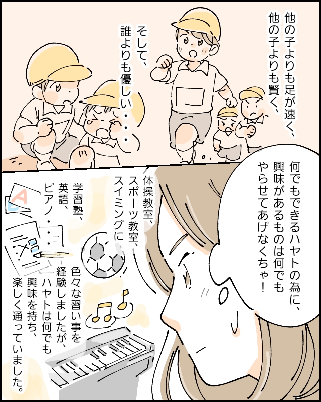 ハヤトは色々なものに興味を持ってくれたし、どの習い事にも楽しく通ってくれたので、何でもできるハヤトのためだと私はどんどん習わせました。
