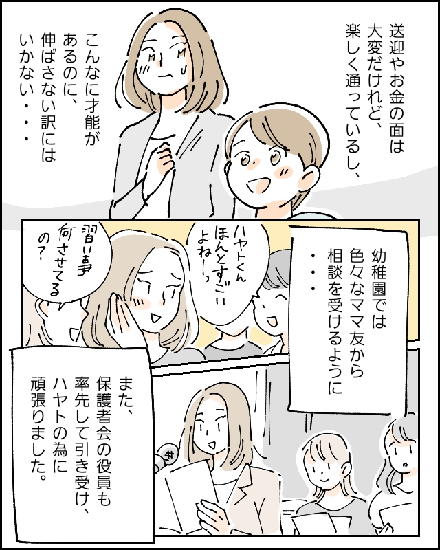 ハヤトくんもお母さんもとっても人気者だったのですね。内心ではハヤトくんを天才だと確信しながらも、笑顔でママ友さん達の相談に乗ったり役員を頑張ったり、周りの人たちと良い関係を築いているお母さんは素敵ですね。毎日の習い事はとても大変だとは思いますが、ハヤトくんが楽しんでいるのなら頑張ってしまう気持ちはわかります。