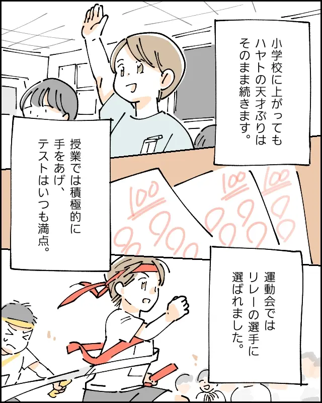 小学校に上がっても、ハヤトの天才ぶりは継続。授業では積極的に手をあげ、テストはいつも満点。運動会ではリレーの選手に選ばれるほどでした。