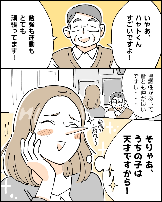 保護者面談では、「いやあ、ハヤトくんすごいですよ!勉強も運動もとても頑張ってます!」と先生もベタ褒め。さらに「協調性があってみんなとも仲が良いですし・・」と性格面でも大絶賛!「そりゃあ、うちの子は天才ですから!」と心の中で思いつつ、賞賛の言葉に私は鼻高々でした。