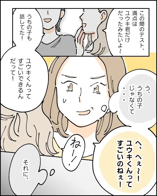 「この間のテスト、満点はユウキくんだけだったみたいよ~」「うちの子も話してた!ユウキくんってすごいできるんだって!」ママ友たちから話を聞いて、「う、うちの子じゃなくて・・」と思いつつ、「へ、へぇ~!ユウキくんってすごいのねぇ!」と言った後、「それに、」