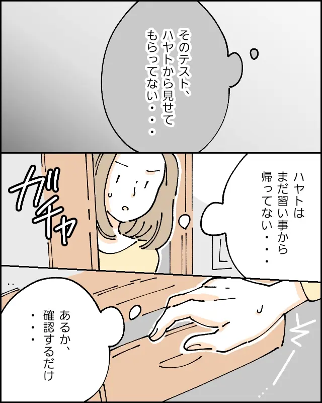 「そのテスト、ハヤトから見せてもらってない・・」と思った私は、ハヤトが習い事から帰っていない今のうちにと、ハヤトの部屋へ行き、「あるか、確認するだけ・・」そう思いながら引き出しに手をかけました。