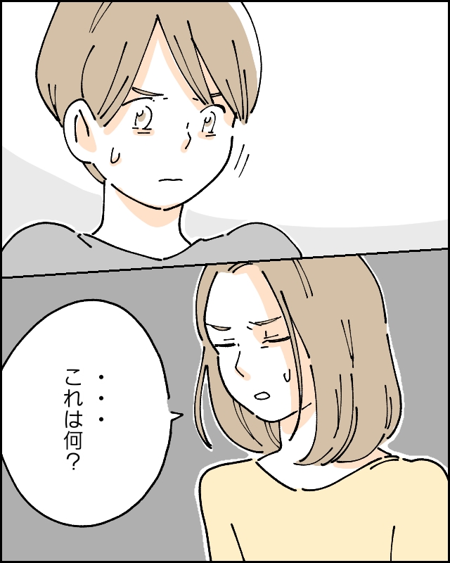 その後、ハヤトが習い事から帰ってくるとリビングで座るように言い、「・・・これはなに?」と隠してあった答案を目の前に差し出していいました。隠していたはずの答案が出て来て驚くハヤトは、
