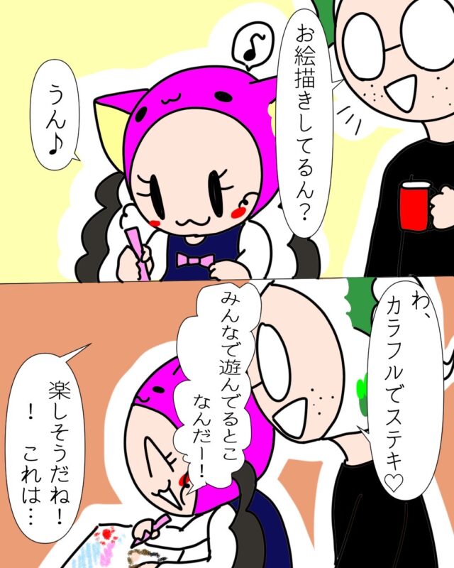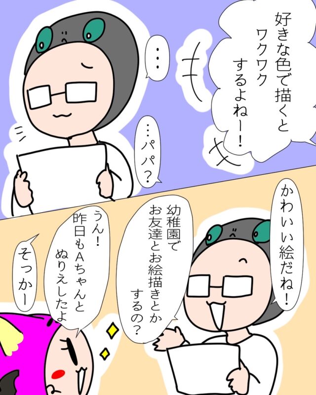 お絵描きが大好きな長女・しょごーき。自分の思うように伸び伸び絵を描く姿は微笑ましく、大人にはない発想に驚いたり