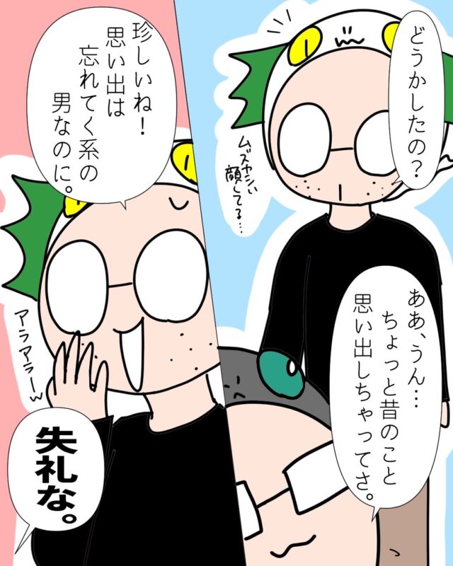 普段無口なぽろさんが話し出したのは、幼少期の苦ーい思い出。かなり細かく覚えているところからして、今も思うところがある出来事なのでしょう。