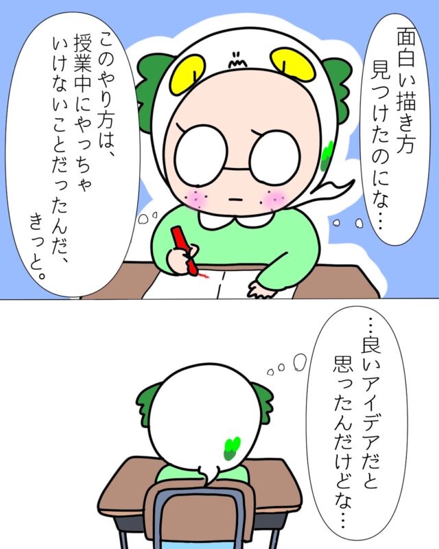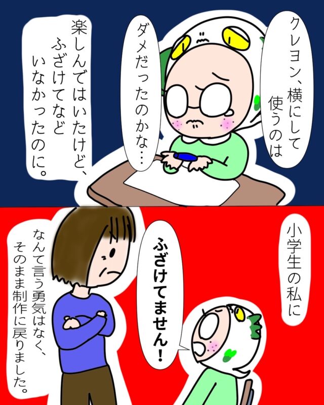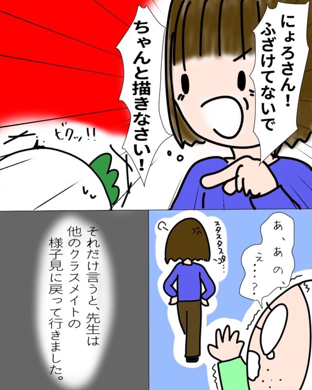 小さなころから創作や絵を描くことが大好きだったにょろさんは、小学校の授業で自分だけの本をつくることになり、喜んで取り組んでいました。ファンタジーなお話の挿絵を創意工夫を凝らして描いていたところ、先生から「ふざけてないでちゃんと描きなさい!」と言われてしまったのです。