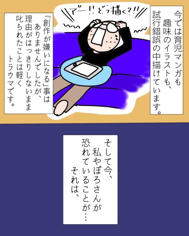 創作は嫌いにはなりませんでしたし、話を考えたりするのは今も好きですが、「思い切った表情、構図、シチュエーション、色使いで描く」のは少し躊躇してしまいます。「なにかおかしいと言われるかも」と不安になります。(誰も言わないとは思いつつ、です)