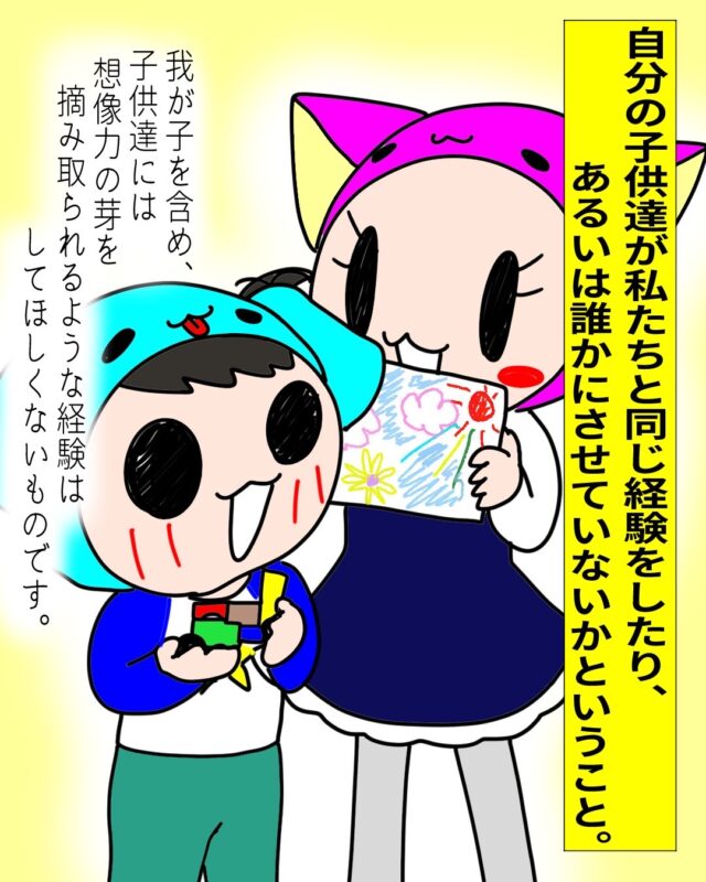みんなの前で大きな声で叱られてしまって、ショックも大きかったですよね。苦い体験を乗り越えたにょろさんとご主人ですから、お子さんたちの想像力の芽は大切に守られることでしょう。
