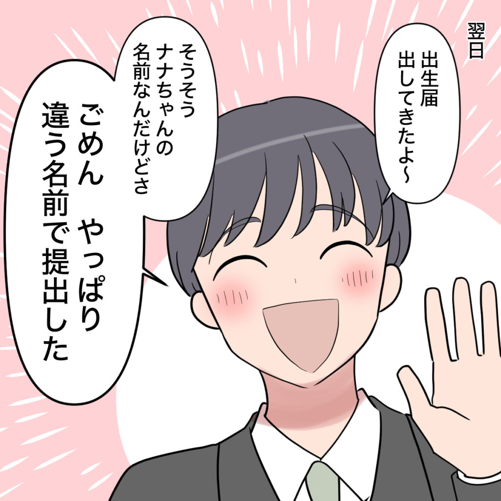 「出してきたよ~」と翌日、出生届を出してくれたショウタがその足で病院まで報告に来てくれました。そこまでは良かったのですが、ショウタが「そうそうナナちゃんの名前なんだけどさ、ごめん、やっぱり違う名前で提出した。」と満面の笑みで言ったのです。私は耳を疑いました。何を言っているのか分かりませんでした。