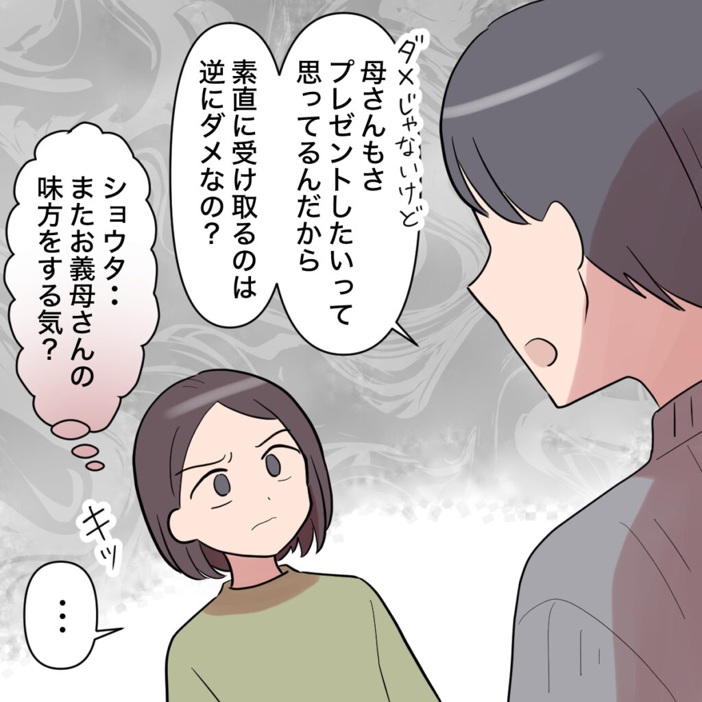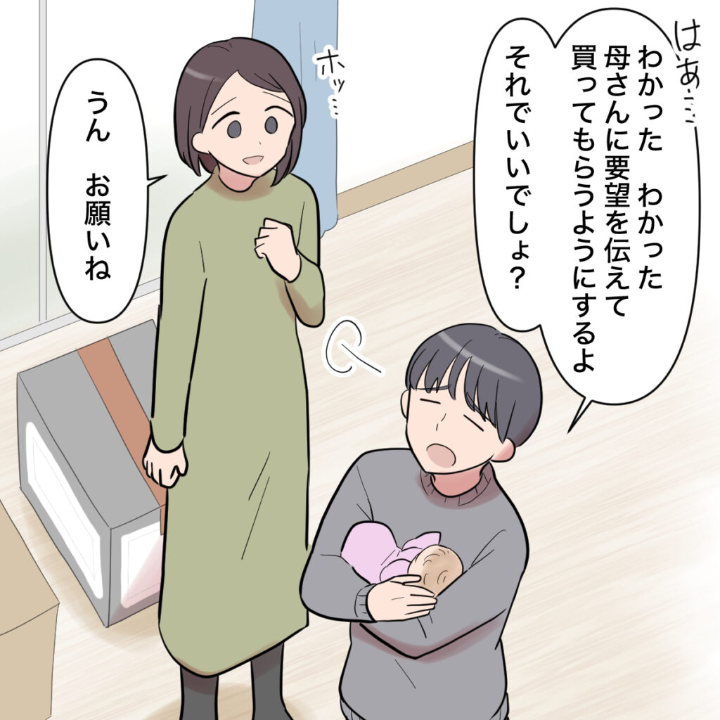 「今後はお義母さんがどうしても贈りたいと言ってきたら、私たちが指定したものをお願いできないかな」と言った私にショウタはため息をつくと、「わかったわかった、母さんに要望を伝えて、買ってもらうようにするよ。それでいいでしょ?」とあきらめたように言いました。私はそれを聞いてホッとしました。