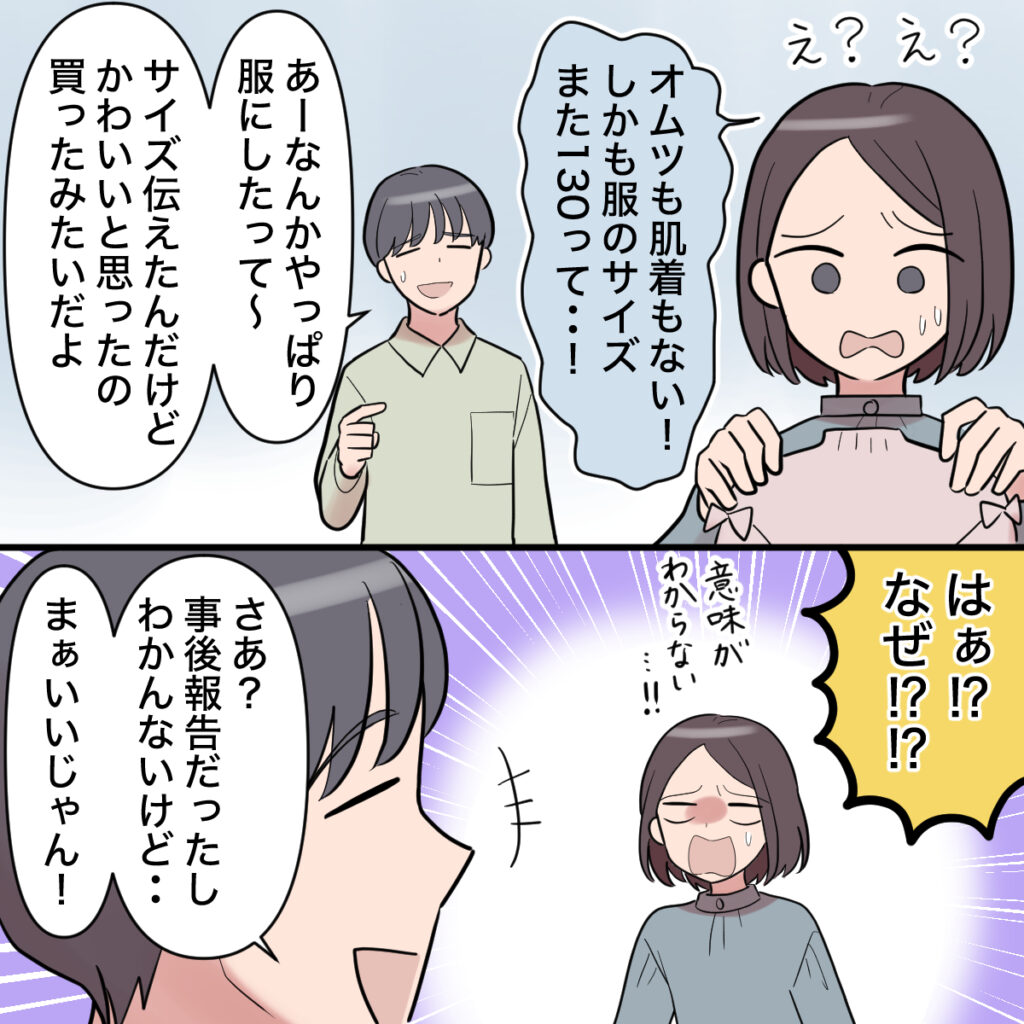 後日、義母から電話を受けたショウタが「母さんがサッちゃんの服買いたいって話してるけど何が欲しい?」と聞いてくれたので、「服はこちらで買うからオムツとか肌着とか欲しい」と伝えました。ニッコリ笑って「了解!」と義母に伝えてくれたショウタ。私はちゃんと話し合っておいてよかったと思いました。贈り物が届くまでは。