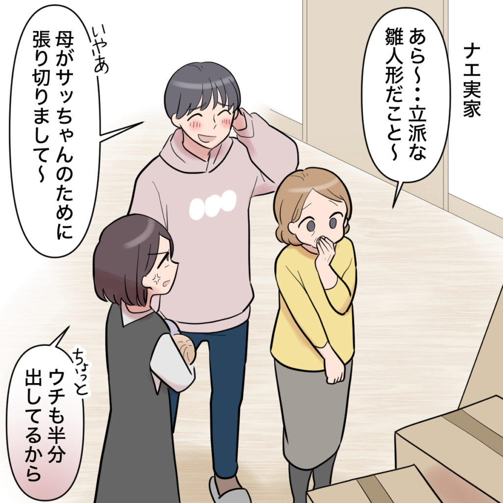 希望を伝えたにもかかわらず、義母が勝手に決めてうちに置けなかった七段飾りのお雛様。結局、私が両親に頼んで実家に置かせてもらうことになりました。実家では「あら~、立派な雛人形だこと~。」と、折半額だけ伝えられた私の母は、お雛様を見て言いました。ショウタはそんな母に「いやぁ、母がサッちゃんのために張り切りまして~」と嬉しそうに義母を自慢したのでイラッとした私は、「ちょっと、ウチも半分出してるから。」と、母は決して言わないであろうことを代わりに言ってやりました。