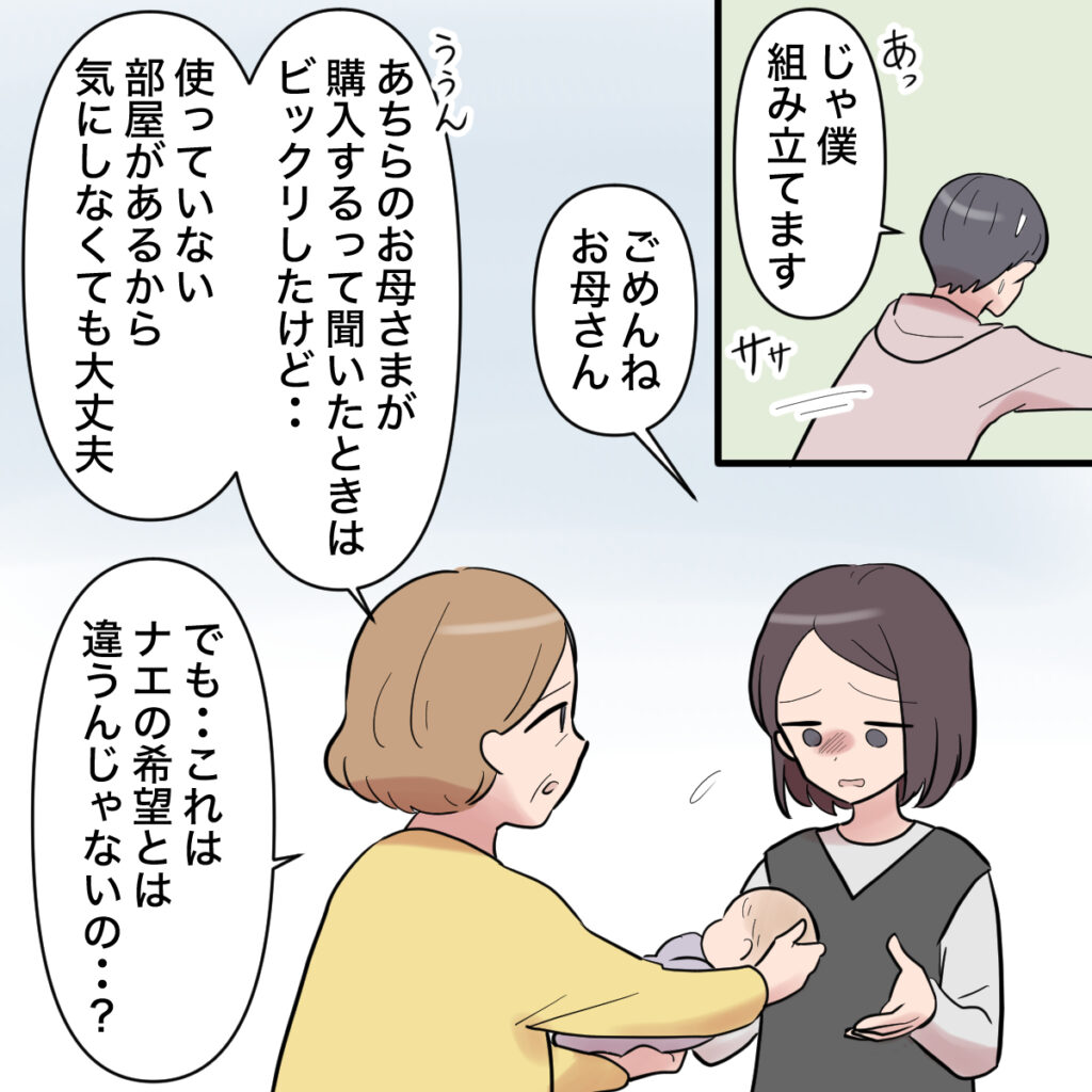 「ナエの希望とは違うんじゃないの?」というお母さんのことばは、それまでの義母とショウタさんの行い全てにナエさんが感じていたことに共通しているようですね。思わずお母さんに弱音を吐いてしまうナエさんの気持ちが伝わります。