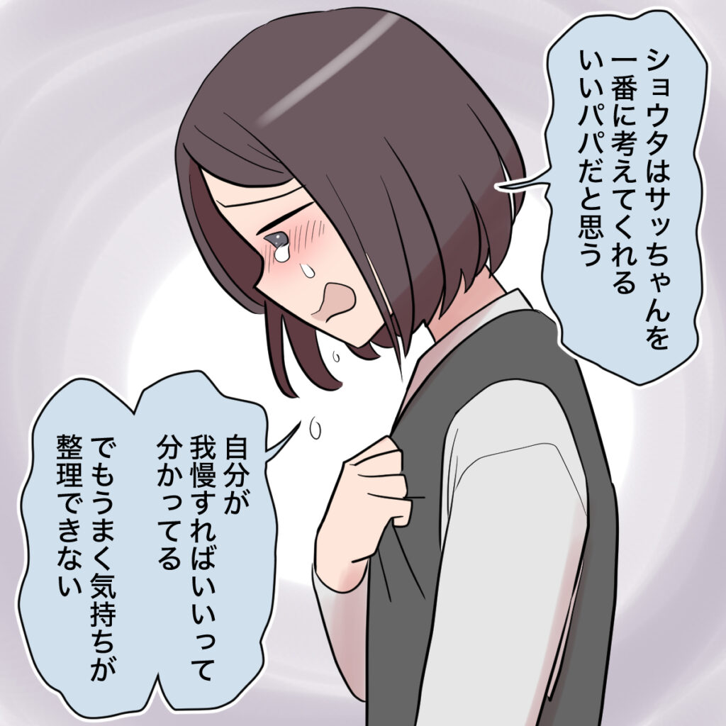 ショウタはサッちゃんのことを1番に考えてくれる良いパパだとは思っています。だから私さえ我慢すればいいのだと分かっているし、何度も自分に言い聞かせています。でもやっぱり気持ちを上手く整理できない。心の内をお母さんに正直に話しました。