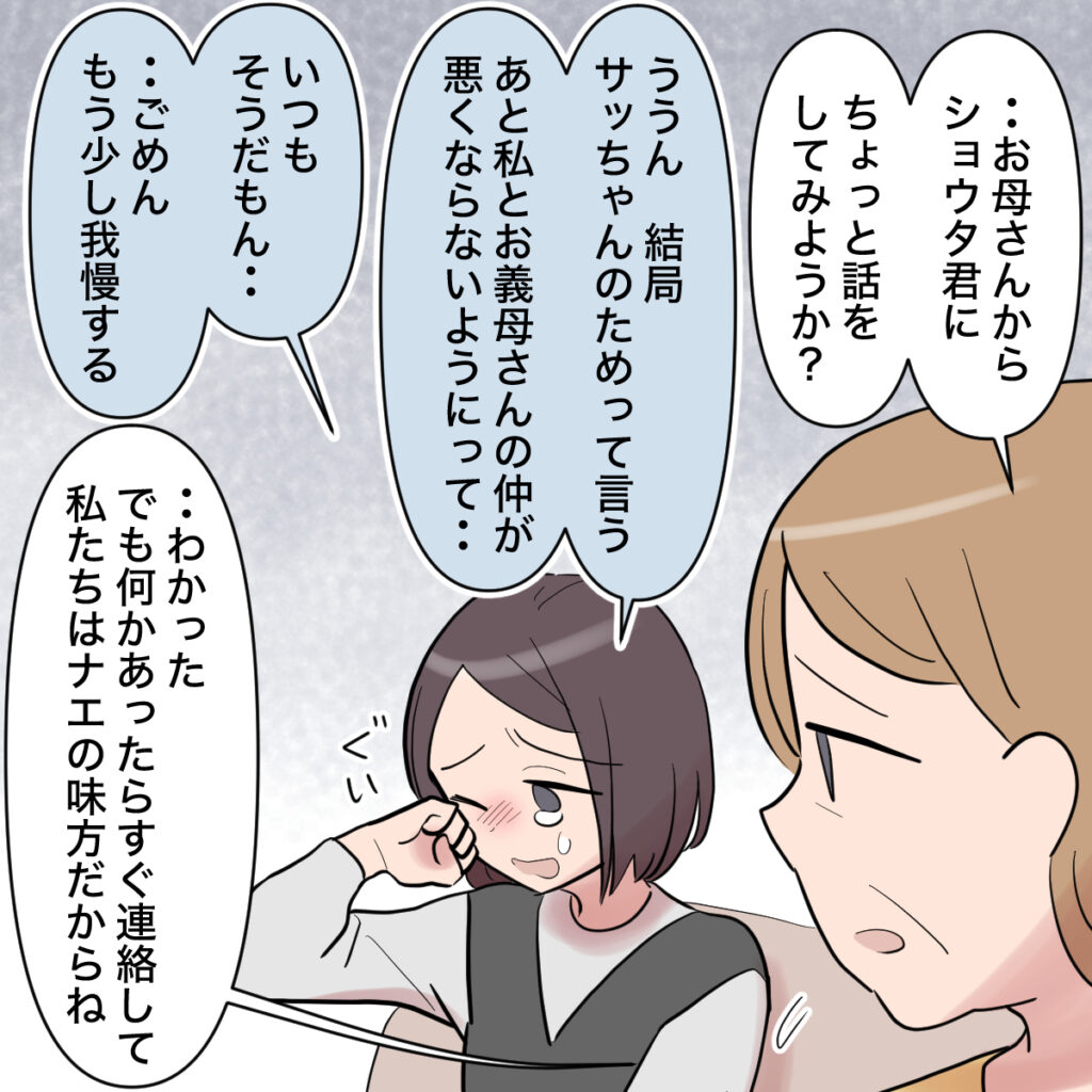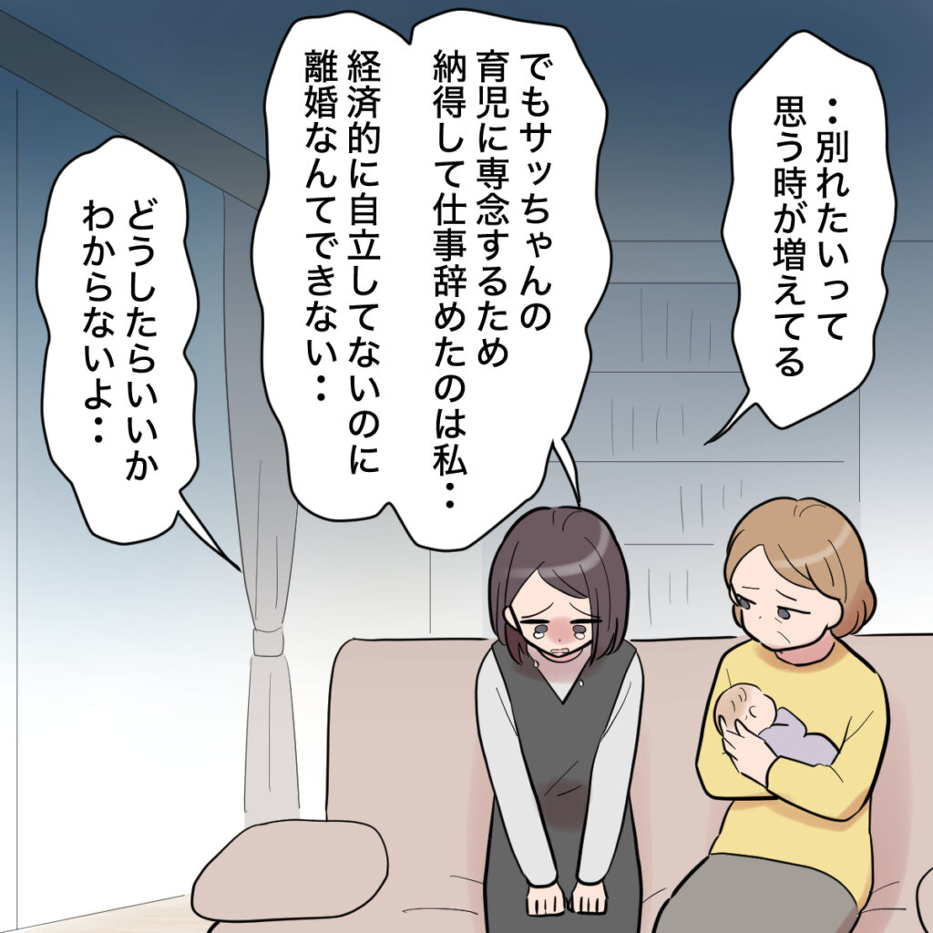 正直、ショウタと別れたいと思う時が増えていることも母に伝えました。でも、サッちゃんの出産を機に育児に専念するため納得して仕事を辞めてしまったのは私自身。今となっては経済的に自立していないことで、簡単には離婚を決断できなくなってしまいました。「どうしたらいいかわからないよ・・・」私はまた涙をこぼしました。