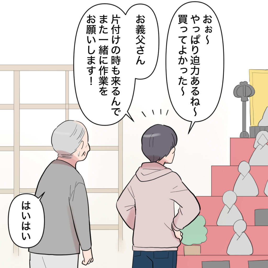 一方、七段のお雛様を飾り終えたショウタは「おぉ~。やっぱり迫力あるね~。買ってよかった~。」と、大満足な様子でした。