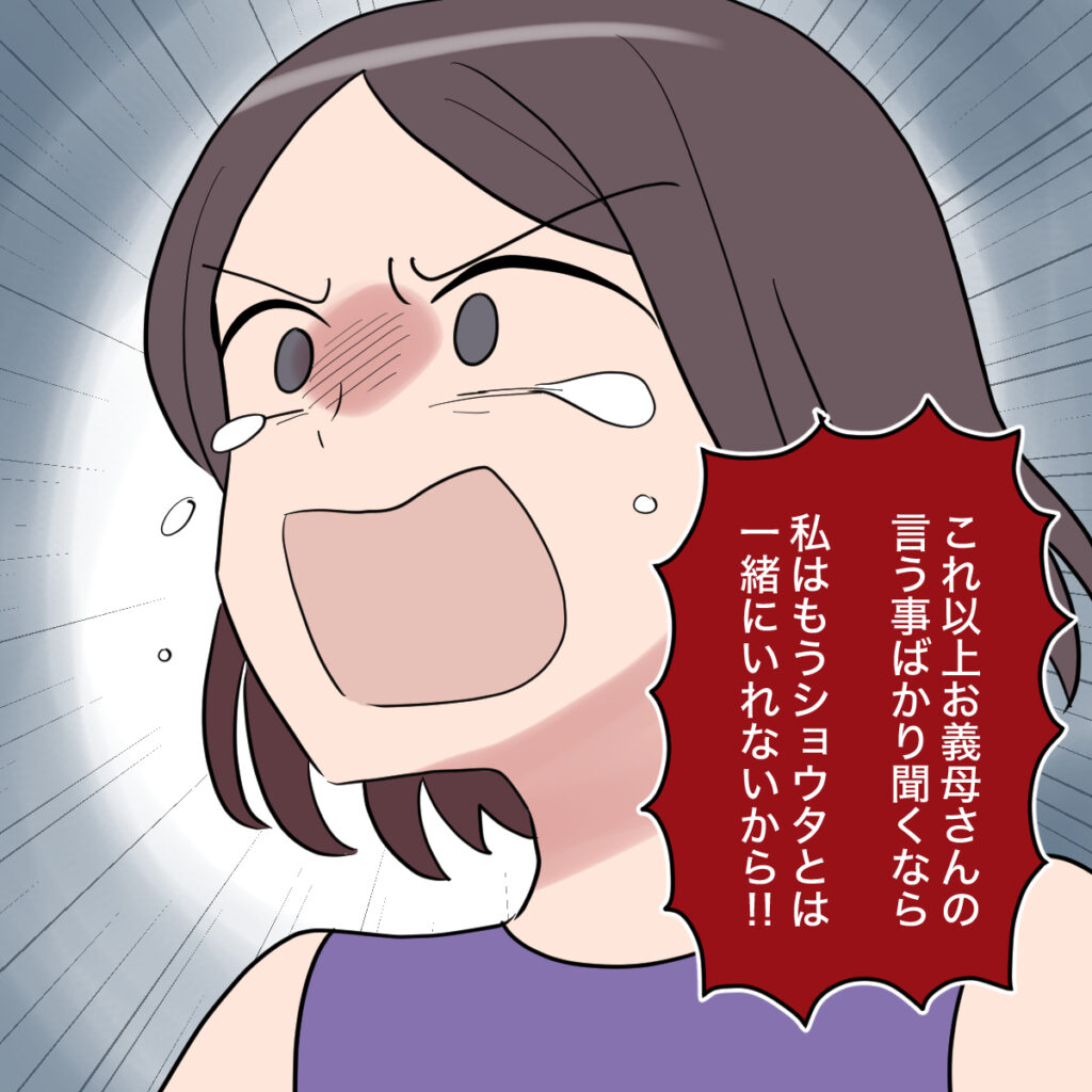 我慢の限界でした。冷静に話す事ができず、私は思わず大きな声を出してしまいました。「私がどれだけ我慢してるかわかる?何度も話しているじゃない、子どもの事は夫婦で決めたいって!」なぜショウタはこんな単純なことを理解してくれないのか、私にはどうしてもわかりません。