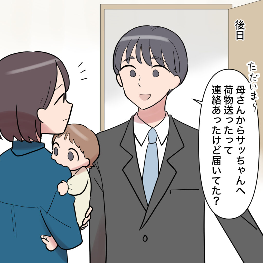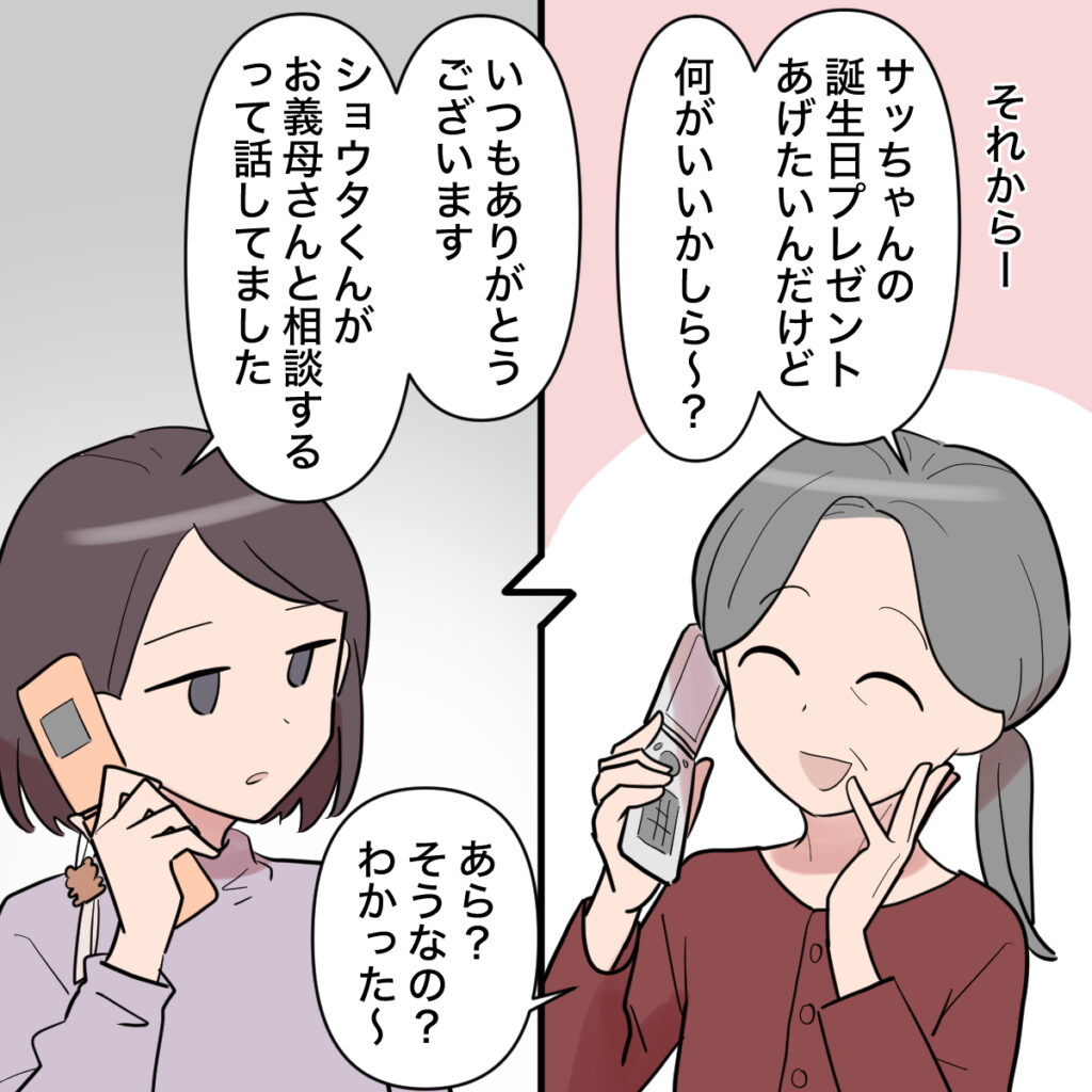 それから、「サッちゃんの誕生日プレゼントあげたいんだけど何がいいかしら~?」と義母からの電話が。「いつもありがとうございます。ショウタくんがお義母さんと相談するって話してました」と答えると、「あら?そうなの?わかった~」と義母が言い、電話を切りました。