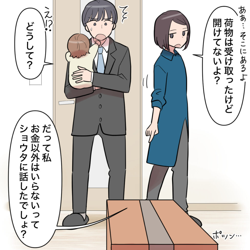 「ああ・・そこにあるよ。荷物は受け取ったけど開けてないよ?」と答えると、「え!?どうして?」とショウタ。「だって私、お金以外いらないってショウタに話したでしょ?」と言うと、