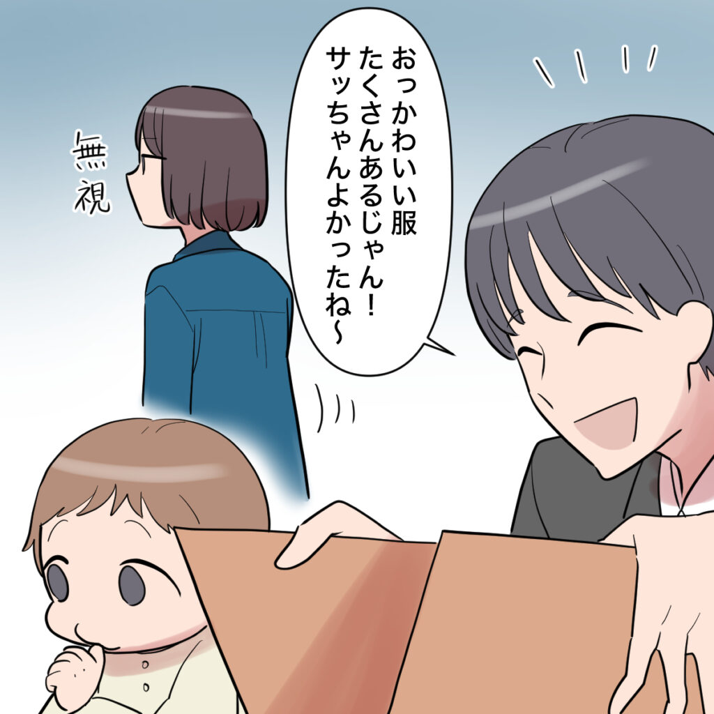 早速荷物を開けたショウタが、「おっ、かわいい服たくさんあるじゃん!サッちゃんよかったね~」と話しかけていたものの、私は無視してスルー。