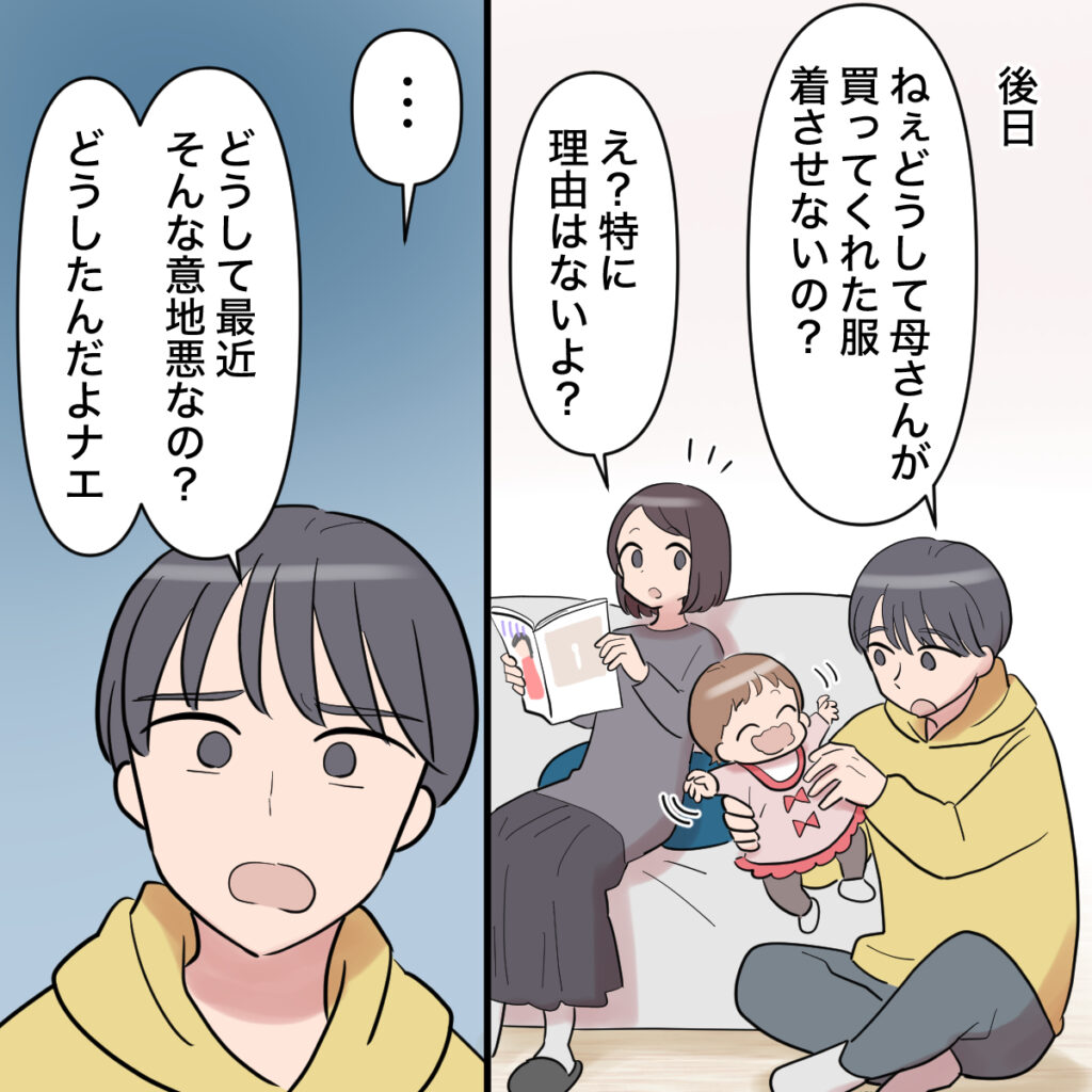 義母からサッちゃんの誕生日プレゼントをあげたいと言われても、ナエさんの気持ちはすでにショウタさんに話した通り。ショウタさんも、ナエさんから「金輪際お義母さんからのプレゼントは受け取らない。どうしてもっていうなら、お金をもらってショウタがサッちゃんのために貯金して」と言われているはずなのに、どうして洋服を受け取ったのか・・。そのくせ意地悪と言われても、答えに詰まってしまいますよね。