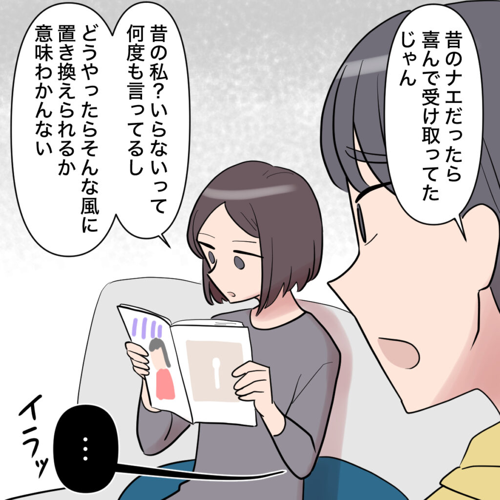 さらに、「昔のナエだったら喜んで受け取ってたじゃん」と言われ、「昔の私?いらないって何度も言ってるし。どうやったらそんな風に置き換えられるのか意味わかんない」と雑誌を見るのをやめずに答えると、ショウタはイラっとした様子で、
