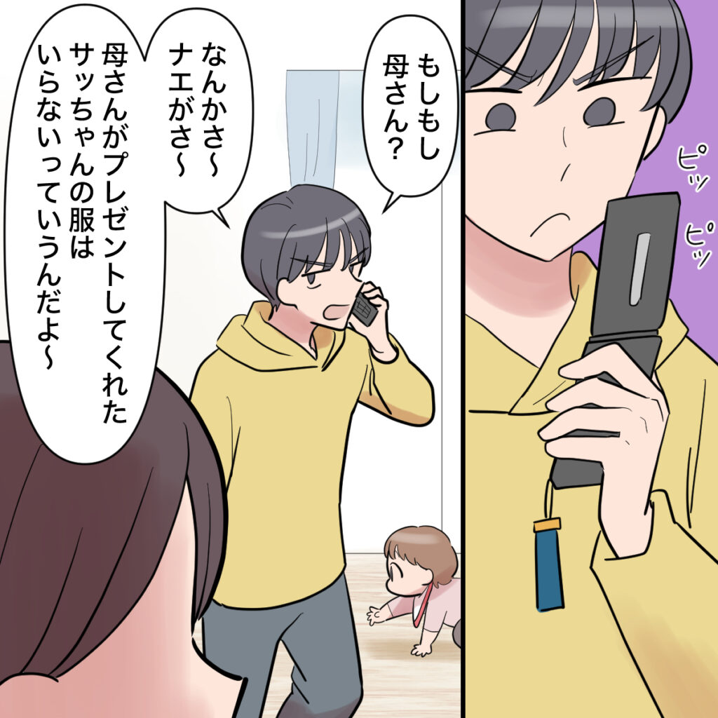 電話をかけると、「もしもし母さん?なんかさ~ナエがさ~、母さんがプレゼントしてくれたサッちゃんの服はいらないっていうんだよ~」と義母に言いつけるように話し出し、