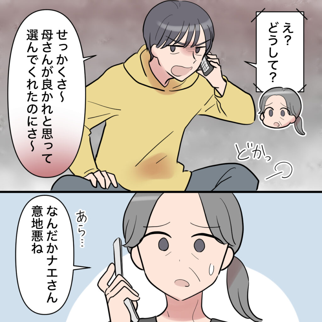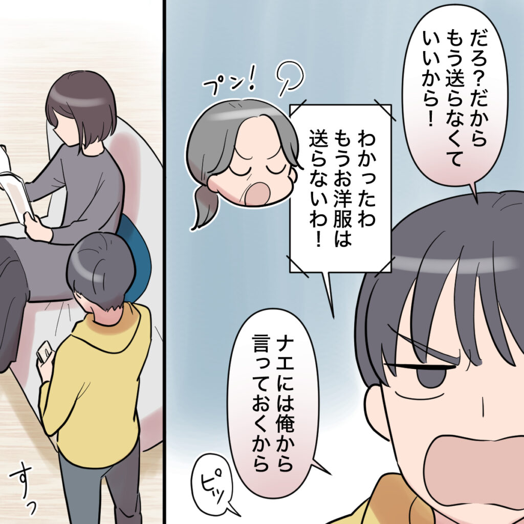 「だろ?だからもう送らなくていいから!」ショウタの言葉に「わかったわ。もうお洋服は送らないわ!」と怒りながら言う義母。「ナエには俺から言っておくから」そう言って電話を切ると、