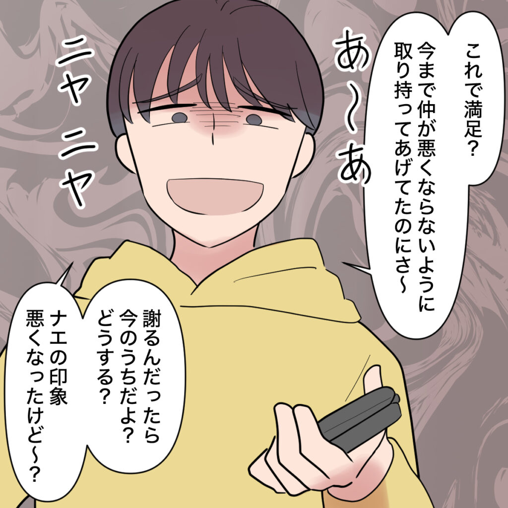 「これで満足?今まで仲が悪くならないように取り持ってあげてたのにさ~。あ~あ、謝るんだったら今のうちだよ?どうする?ナエの印象悪くなったけど~?」ニヤニヤしながらショウタがそう言いました。