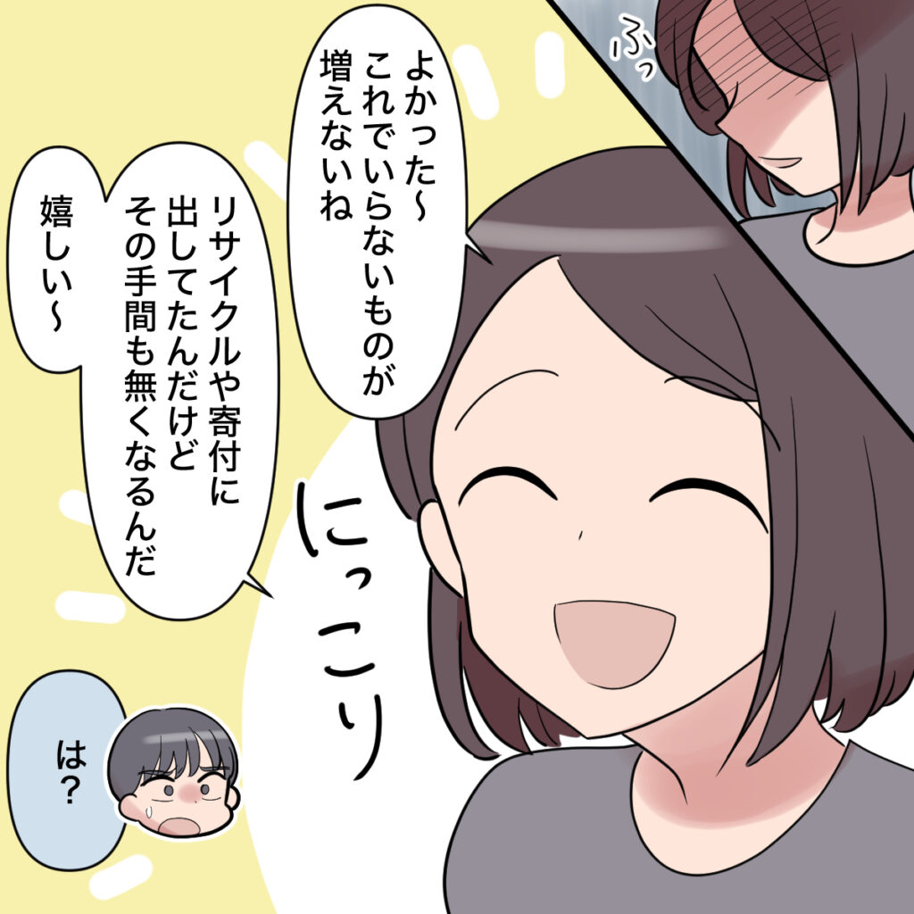 義母からサッちゃんに贈られたたくさんの服を一度も着せない私にショウタに意地悪と言われ、更に義母に電話して私に聞こえよがしに「よかれと思って選んでくれたサッちゃんの服を要らないって言う」と告げ口すると、私の印象が悪くなったと勝ち誇ったように言うのでした。そんなショウタに私は「よかった~。これでいらない物が増えないね」と笑顔で返しました。