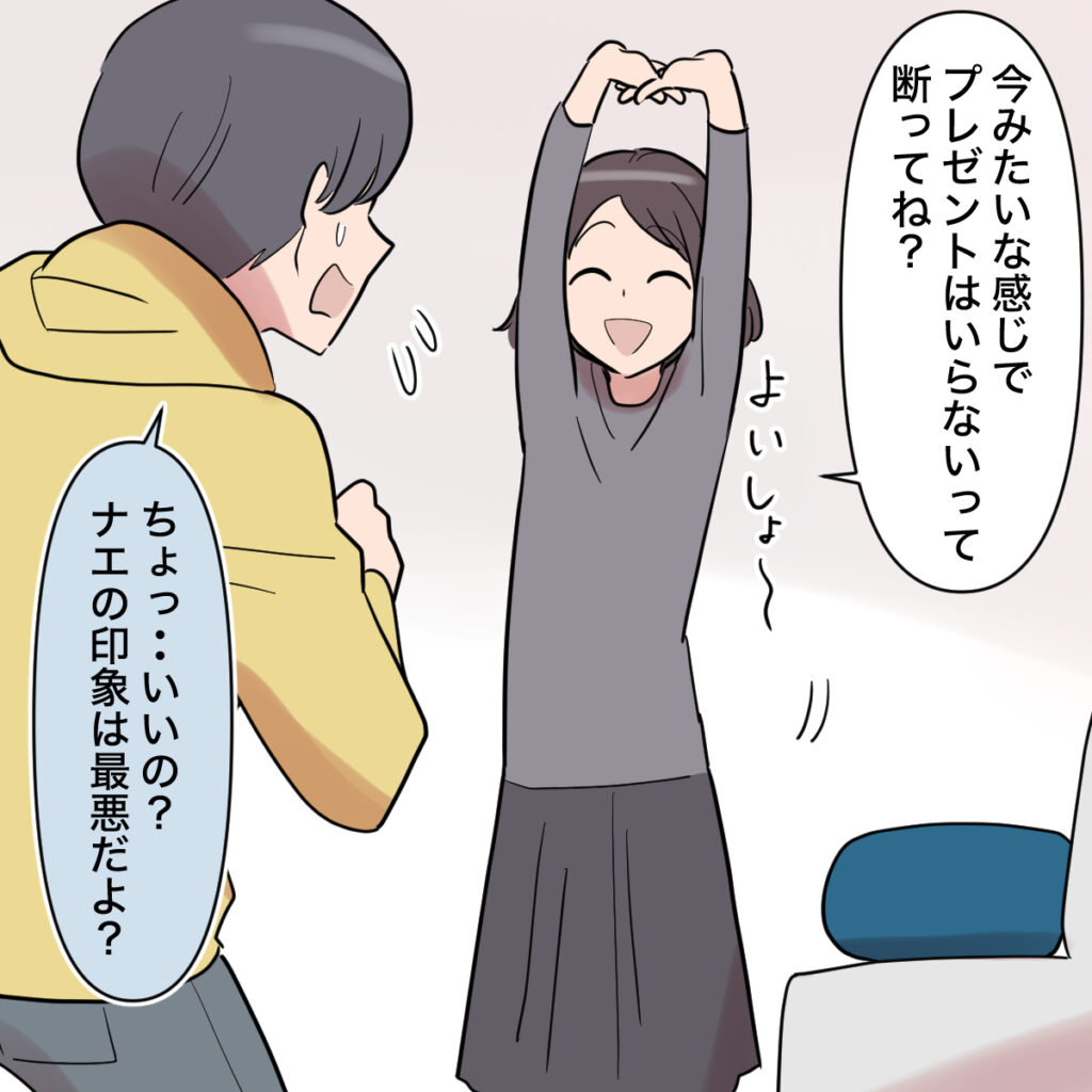 義母への印象を悪くされ、私が焦るとでも思ったのでしょうか、ショウタは「今みたいな感じでプレゼントはいらないって断ってね?」と喜んで答えた私の態度に慌てました。「ちょ、いいの?ナエの印象は最悪だよ?」